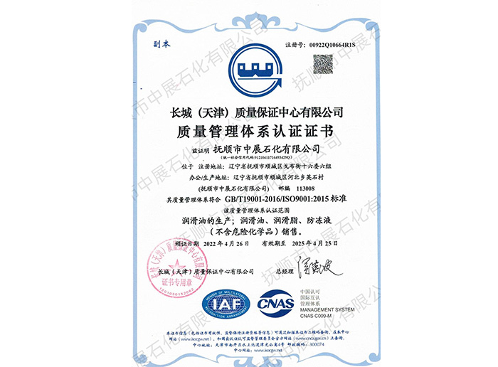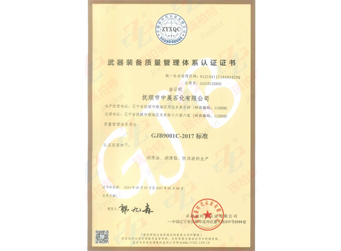 本公司是GB/T19001-2016/ISO 9001:2015標準質(zhì)量體系認證單位(注冊號:00922Q10664R1S),是GJB9001C-2017標準武器裝備質(zhì)量管理體系認證單位。撫順在上個世際五十年代就已是我國軍用油脂的生產(chǎn)基地,本公司正在發(fā)揚和繼承這一優(yōu)良傳統(tǒng),全力投入于各種軍用、航空油脂的生產(chǎn)與研發(fā)。